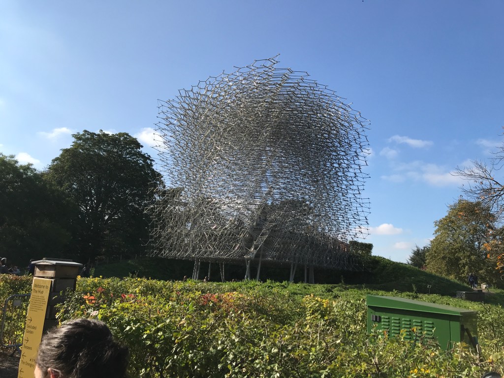 After spending around 4-5 hours on a coach, we finally arrived in London where our first stop was the Kew Gardens. The Kew Gardens is this vastly huge nature complex that is filled with art pieces and scientific research that helps better understand Botany, Horticulture and Agriculture. Sadly due to restriction with time we weren’t able to explore the whole of the gardens to our hearts content but we were able to explore one piece in particular called “The Hive”. The Hive is a giant layered sculpture of metal piping that creates a visualisation of what it sounds like within a beehive, making an illusion of sound and sight to provide better understanding of bees and their behaviour in a beautiful and creative way.