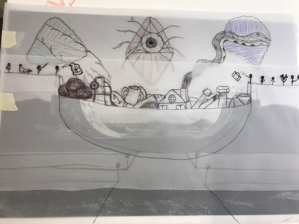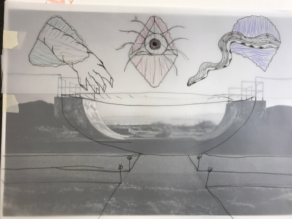 At the start of this project, we were given a plain ordinary image of a certain scenery which we had to incorporate our 3D project work into. Now my process into figuring out how to incorporate my objects into a 2D format was to layer the concept I had with different layers of tracing paper to show development and extension of that idea. That way instead of having one large sketched format, I created an adaptable multi layered format so its easy to rearrange and change up ideas if needed.