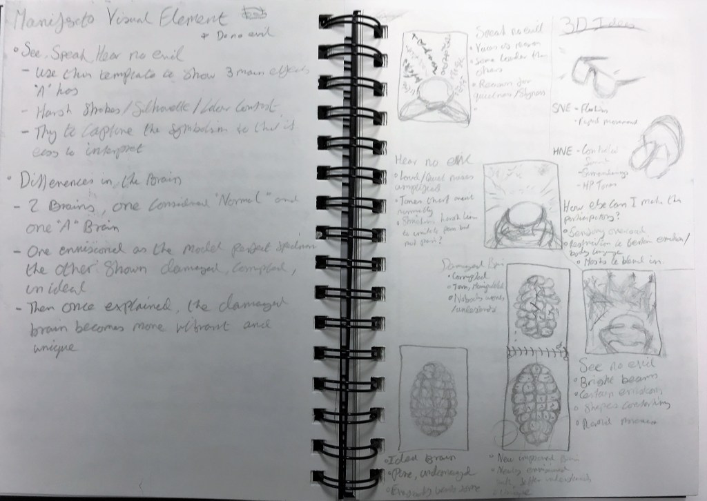 After creating my statement, It was time to expand on that idea and decided how to generate a Manifesto based around it as well as create something to visualise the manifesto itself. I knew from the start that since this project would be personal I would want to do it about autism and how it feels from my own unique perspective as every person with autism is different. This led to the creation of ideas for an interactive storytelling piece which is both informative and easy to understand for people who don’t know the knowledge about the autistic spectrum properly. The concept consists of a zine explaining the main misconceptions of the autistic spectrum, how autism itself effects me personally and also a small information section regarding autism and what questions people tend to ask a lot about the subject.
