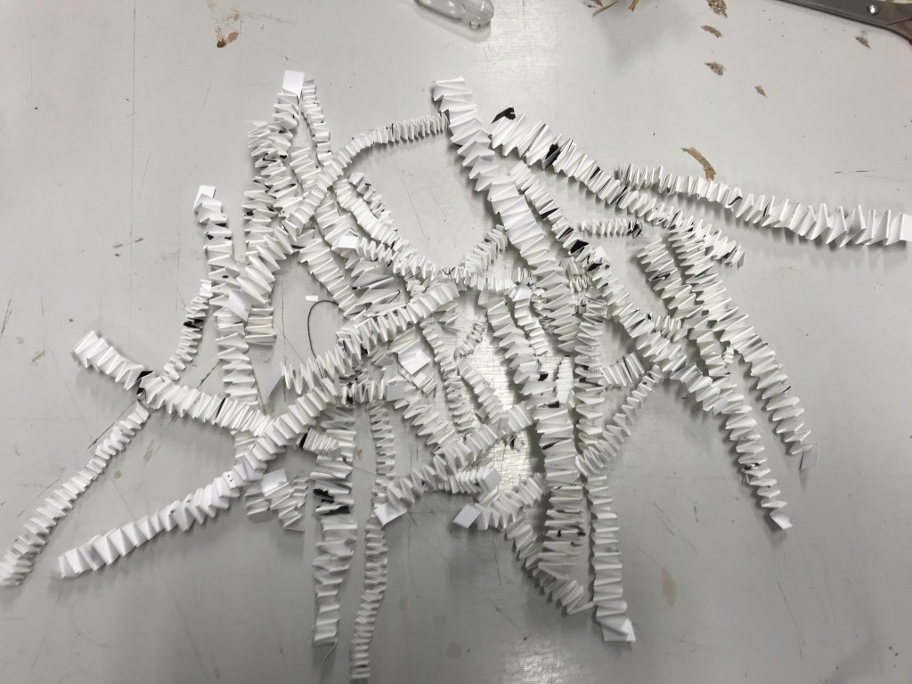 As a part of our visual studies for this project, we were given the task of taking A2 sheets of messy used paper created from previous students and completely change them so that they look nothing like how they looked originally. I decided to take the challenge of transforming 3 A2 sheets into different forms. One I folded until I couldn’t fold any more, I then took another cut it into different segments so each piece of paper would look different. For the final piece of paper, I cut it into long thin strips and converted them into paper springs which were then wrapped in fabric and turned into one of my textured objects.