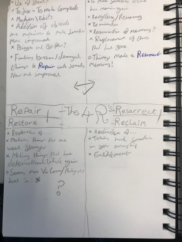 When given the brief on the 4R’s, I decided to dissect the 4R’s into their own component to see which one would be the easiest to tackle and use for my project. After working through what possible outcomes could come from each R, I finally decided to combine both Repair and Resurrection to use as the main construct for how my work would be carried out throughout the project.