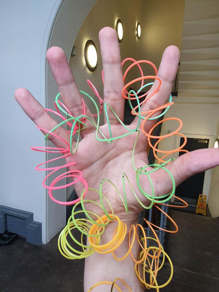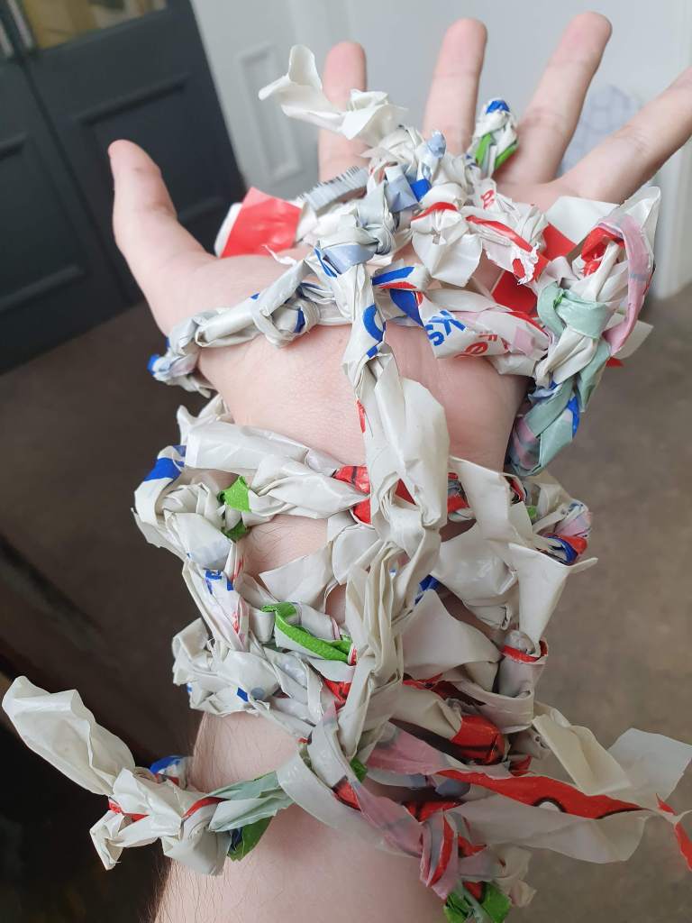 To cap off the week, we were given the task of viewing objects differently, combining them with anatomy to give our objects a whole new use than what they were originally made for. As an artist with a huge focus in making with strings and fibres, I took it upon myself to experiment with different types of knitting that I had made out of different materials such as wool and shredded plastic bags. I used these objects along with some cheap slinky springs and combined them with the process of entwining and enveloping a form to give a sense of feeling confined while also showcasing an unnatural way of perceiving the power of nature.