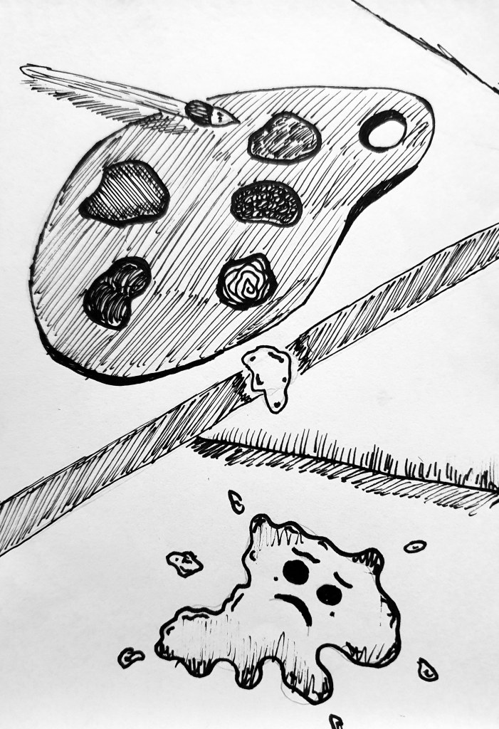 Meet Pearl! She was excited to be used for her artist’s new project but did not expect how clumsy they would be. Now she just lays splattered on the floor, sad about missing her opportunity.