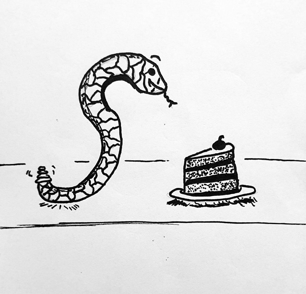 Meet Sally the Snake! Most people would complain if they did not get a good piece of cake, but Sally is more than happy with what she gets! She is just ecstatic to be included.