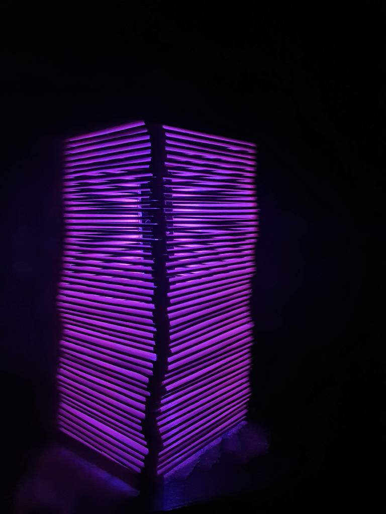 When fully constructed, this is how the final piece came out. I am honestly so proud of how it turned out as it came out a lot better than I originally designed. The design of the LED wand worked wonders and was able to fully light up the shape without any gaps. If I were to make any additions to this piece, I would have created a stand that would hold everything into place rather than the lights and all of its components stored inside of a box that the shape itself sits on.