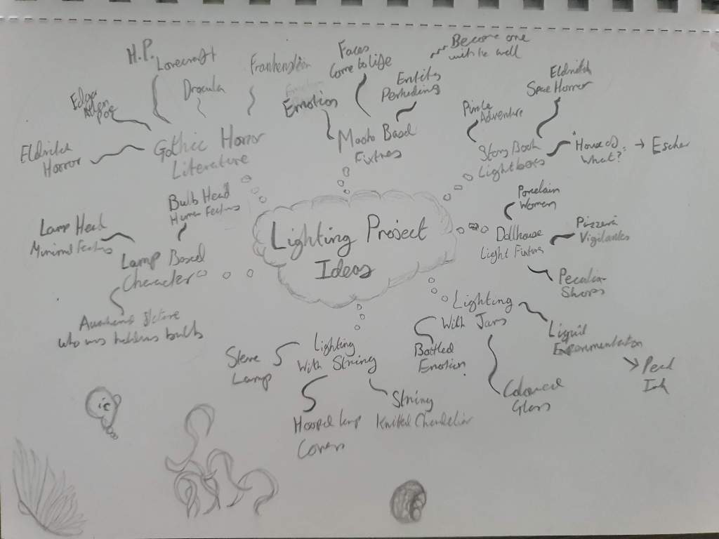 After conducting research into different types of lighting and light-based artisans, I decided to put all my ideas onto paper to be able to see all the potential avenues I could take. Most of the time, I can narrow down my ideas and concepts until I find one to stick to. However, with this project, I wanted to develop all the concepts I could on paper beforehand to give me a better idea of what forms they could take.