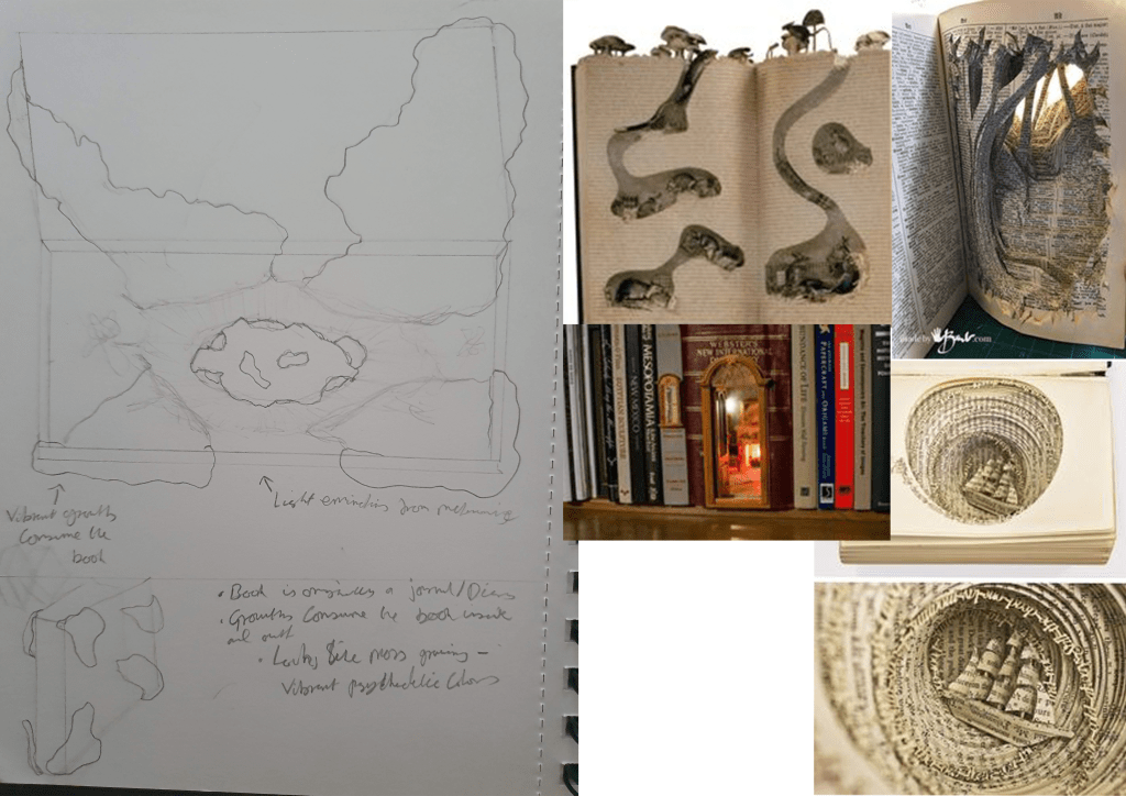 When considering how to bring a story to life through light, I came up with the idea to take a more literal approach and bring a story out of a book by creating a scene within one. To achieve this, I would have hollowed out a book and added embellishments along with LED lights to create a scene within the book. The lights inside will be triggered when open and turned off when closed so that it still contains the facade of an average book (Unless there are embellishments to the exterior of the book that add to the narrative. An example of this is illustrated below in a concept sketch which depicts a scene from the H.P. Lovecraft short story titled The Colour of Space. The book itself will have a facade of an old journal that has been lost in time, covered in ash and strange extraterrestrial growths that emanate with an odd pink glow. These growths continue to grow inside the book and originate from a crater caused by a meteorite that emanates the same pink glow.