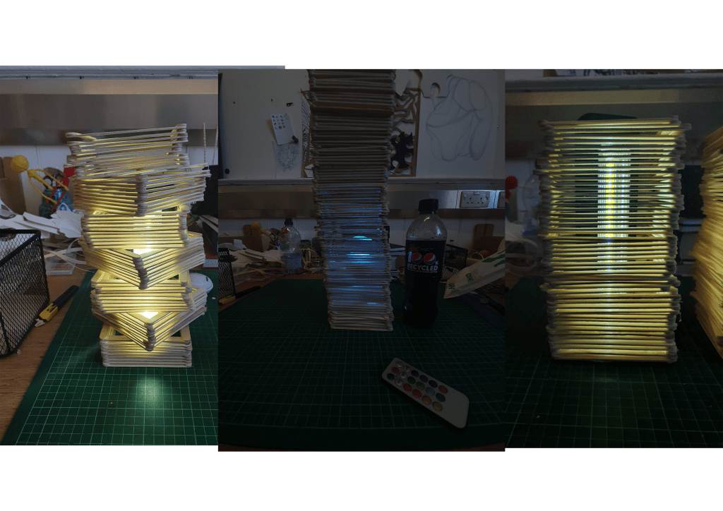 When originally using light to shine through the shapes that I made, I worked with floodlights and small LED circular lights to experiment with light strength and colour variance. I knew to avoid bulbs due to the heat they can give off so I knew it was best to stick with LED light-based sources. With this experimentation, I found that floodlights provided a strong light source but only in a singular direction whereas the LED circular lights provided different colours, they were too small to fully light up the whole form and were very troublesome to stack on top of each other to be able to actually fully light up the shape. This led me to try and figure out a way to try and make a light that has the same shape as floodlights, can shine light in a 360-degree manner and can shift colours like circular lights.