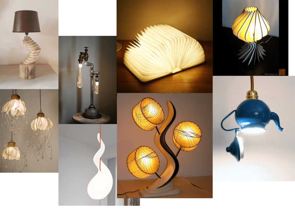 When I was first given the range of live briefs, the lighting brief just stuck out more to me than the others. As soon as I received it, my mind jumped into brainstorming mode and looked into what kind of light fixtures I could make. I knew I wanted to create something with irregular form and curious shapes, something that was unique and strange but still looked like a complete decorative piece. With this mindset, I found myself drawn to curved shapes, repetitive spirals and the reuse of other objects to create a whole new item.