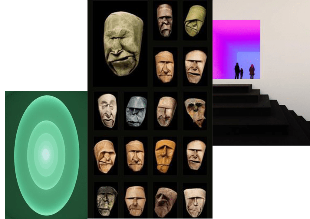 A more simplified version of this concept was designed after figuring out how complex the mask could end up being while also providing a more friendly version to people with a fear of masks. This version was inspired by the works of James Turrell, an American light artist who is known for his gradient use of light to create illusory effects on several types of scales (examples shown below). My concept would be an opaque glass shape replacing the mask on the stand tapered with LED Lights to just provide an ambient background light more simply. The light used can be colours that best represent an emotion when applied to colour theory and what the colour could be interpreted as when seeing it as an emotion (e.g. Blue = Sad, Red = Angry).