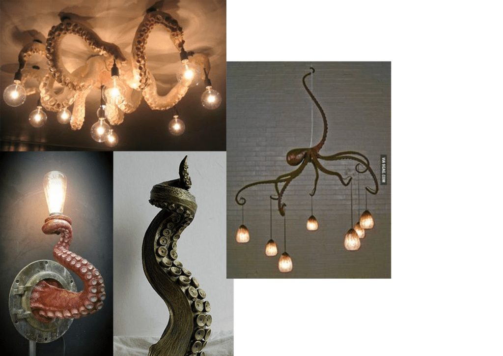 Another unorthodox form of lighting that I found was the use of wool in the creation of lampshades and covers. Oddly I initially found this one to be quite dangerous due to the heat given off by bulbs and how the use of wool in this way could potentially be a fire hazard. However, after research, I found that wool is naturally flame retardant and safer than other fabrics and fibres used in traditional lampshades. With this discovery, I designed a concept that takes my love of the medium of wrapping to create a twist on the Tendril Chandelier design I thought of when looking at H.P. Lovecraft-inspired pieces. By taking thick gauge wire and the cables used to light the bulbs and wrapping them in wool until they are concealed, I could use the arms as a way to suspend light while the wire I put inside can be used to adjust them into various types of shapes. After sketching out the concept, I found that it can also be looked at as a quirky floor/desk lamp if inverted (As shown below).