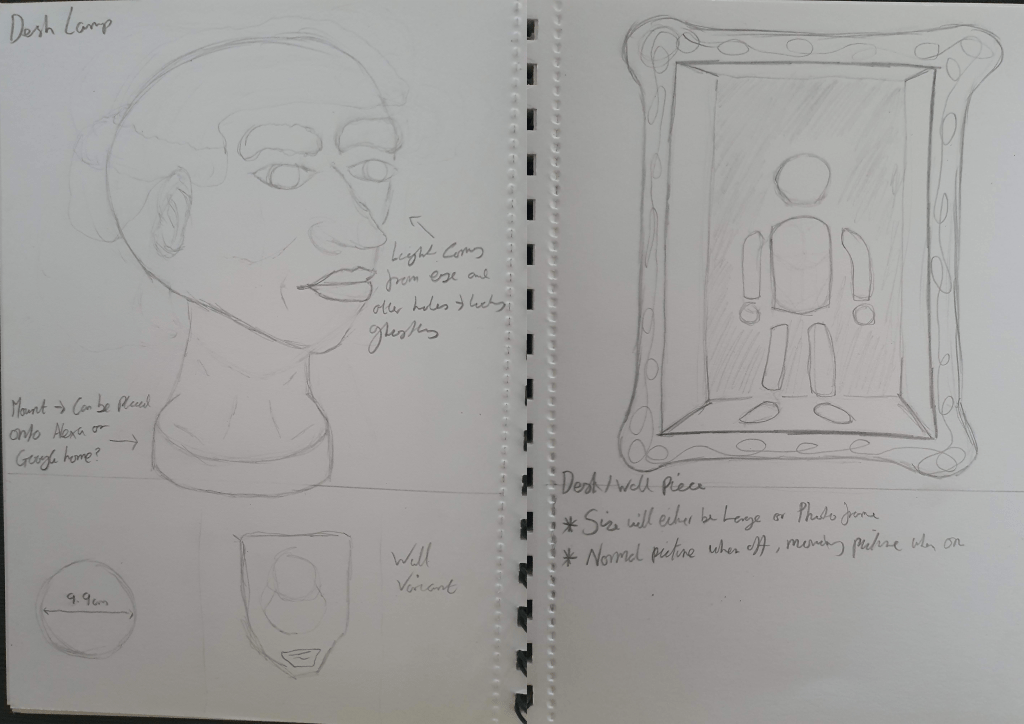 After looking into moving components and interactive pieces along with being surrounded by Halloween hype and fun gimmick-style decorations, I thought it would be fun to design concepts for light pieces that could be used in a haunted mansion setting. The first of which would be an ethereal style bust with a sarcastic personality, light softly emanating from the entire piece but brightly piercing through their eyes. The bust itself is a complicated concept that would be integrated with a home-type AI (like Google Home or Alexa), acting as a head to a bodiless voice. The piece could either act as a typical bust standing horizontally on its own or in a comedic way, could be mounted on the wall like some form of hunting trophy,