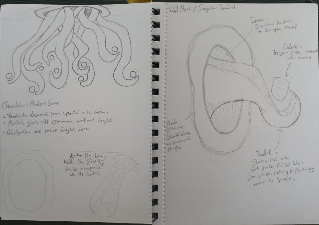 When I found myself drawn to curling forms in my initial research, my mind jumped to tendril shapes and influences of H.P. Lovecraft’s writings about otherworldly creatures and celestial forces beyond our capability of understanding. Being a fan of Lovecraftian themes in narrative, I wanted to create a light fixture based on the stories I have grown to love. The main idea I came to have was a pendant piece designed to look like a portal into deep space with dark-scaled tendrils protruding from the opening. The tendrils themselves are covered in dark purple scales with slight tints of light to look like a vast starscape and at their ends are suspended orbs of celestial light. Another form of this idea was a simplified piece where a wall-mounted pendant portal has only one tendril and orb coming out, kind of like a sconce-style design with a dark twist.