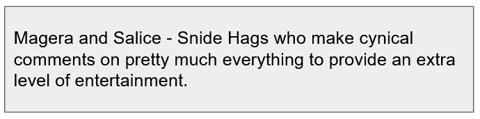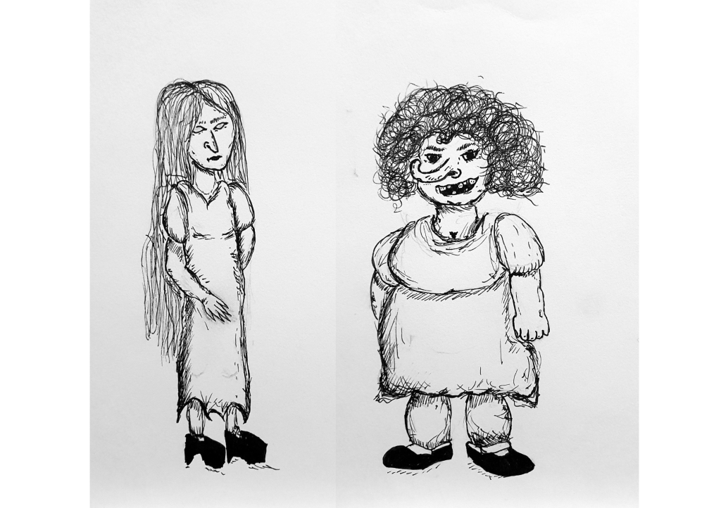 To start with, the first characters I conceptualised when coming up with this project were The Cynitches. These two witches are the embodiment of my cynicism, always finding an opportunity to make snide comments and remarks whenever a situation causes me to lose focus or become frustrated. Magera (Left) is a stout crumpled mess who croaks with a lilt when she cackles while Salice (Right) is a more sleek tattered hag who with her clouded sight bases her remarks on the sounds and smells of the situation.