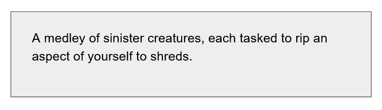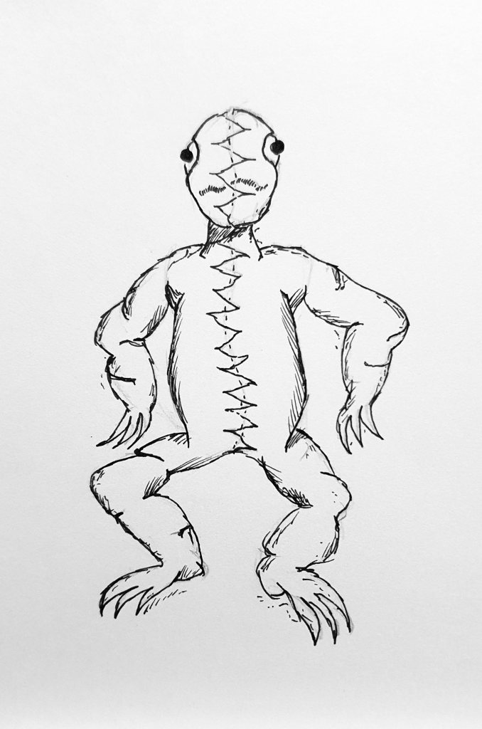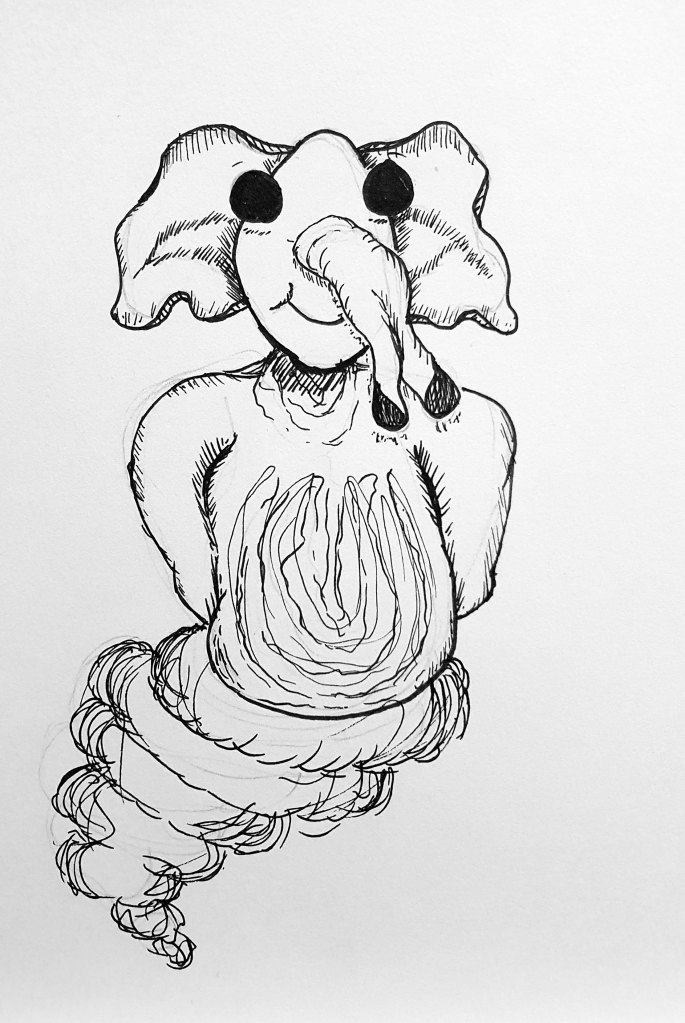 Where there are a lot of creatures in my mind that are the embodiments of negative effects, this thing is a form of catalyst that strengthens those effects and how they impact me. They thrive when I am in my shutdown state, feeding off of all the negative energy created through anxiety and paranoia. Disguised as a sewn-together creature, they split down the middle to show off a large gaping maw to latch on and consume.