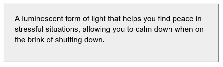When I am in a shutdown state, I can find it to be very isolating and hard to climb out of without support. That is why I usually have my coping mechanisms to centre myself and bring myself into a more rational thinking state so I can better pull myself out of stressful situations and calm down. The original concept for this character was a doppelganger version of myself to slap sense into myself, but when considering the best way to personify coping mechanisms I found that I wanted to take things into a more serene approach. With that in mind, I chose to create a character as a fun buoyant form of fluorescent light to create a sense of calmness that envelops the mind to help the brain relax when on the brink of shutting down.