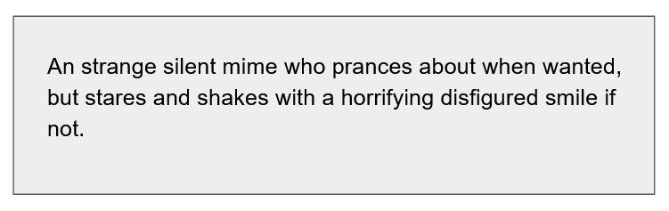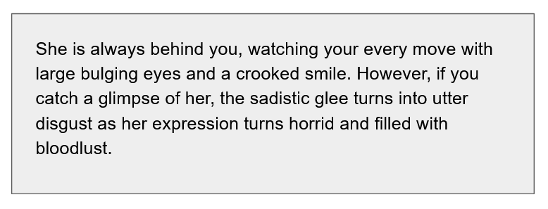 The most horrific concept I came up with aligned a lot with my motives behind how I wanted the presentations to go. Since openly presenting to a crowd would have brought Angeline into full effect for me, I would have loved to have made it a shared experience and had her present with me on stage. However I wouldn’t pay any attention to her as I already know what she is capable of, but since the audience doesn’t they would have to endure the same feeling of having daggers stared back at them. I think that to pull this concept off, I would have had to make a mask of Angeline for someone to wear as well as have the person wearing the mask begin with staring holes in the back of my head but become more infatuated with the audience as the presentation progressed, with even more radical version of this concept including Angeline herself leaving the stage and sitting behind someone random.
