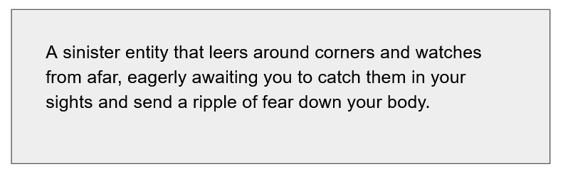 Much like Angeline the Watcher, I also sometimes feel like something is watching me from the shadows. With this sense of paranoia combined with my overactive imagination, I tend to visualise some form of creeper hiding around corners within my peripheral vision. This probably stems from a childhood worry of getting caught past curfew and not wanting to get caught, using my hypersensitivity to sound to determine footstep proximity and who they belonged to. However now that I have been living on my own for the past few years and have no idea who the footsteps belong to, that worry has changed into something more twisted and has formed into this embodiment that can send ripples of fear throughout you when you catch a glimpse.
