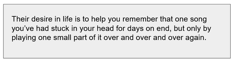 The next character I created was Ernie the Earwig, an enthusiastic creature with a passion for groovy tunes. Rather than picturing an insect nestled in my brain, I think of Ernie and how he likes to repeat the most annoyingly catchy parts of songs until I either relisten to the song or go insane. As music is a great form of escapism for me, I try not to listen to things on repeat too often as it may ruin the song entirely, but if one song is overly catchy then this asshole makes sure that I listen to it over and over and over again.