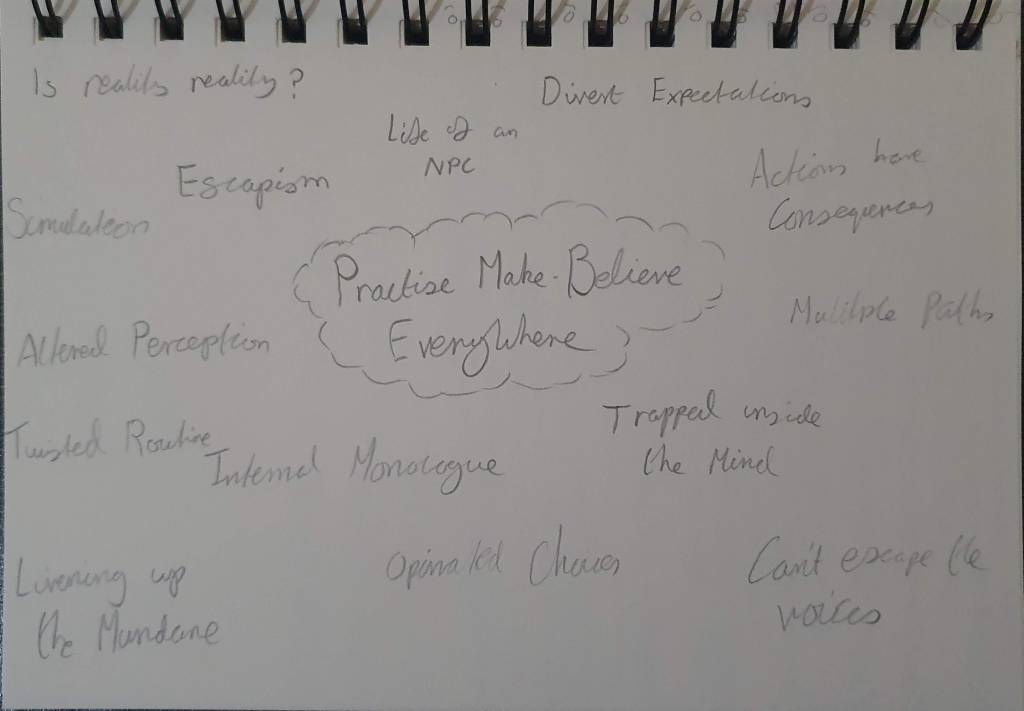 When I was initially given the brief, I went ahead and mapped out a few keywords and phrases that came to mind when thinking about the process of make-believe. I was originally drawn to concepts like Escapism and Altered Perception as well as looking at the practices commonly used within my projects, such as Livening up the Mundane, Channeling the Inner Monologue and being Trapped within the mind.