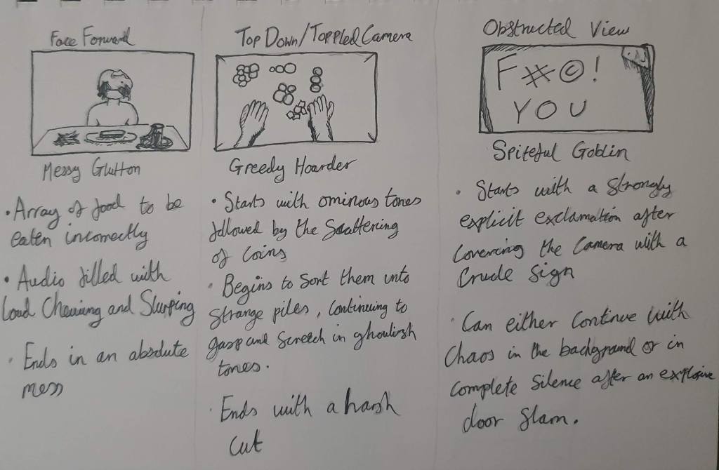 After analysing my final three choices, I decided to go ahead with the messy glutton concept. I chose this idea because I found myself loving the idea of evoking the same sense of disgust I personally feel when Urglex is active inside my head, but also showcased the appropriate levels of both spite and creativity that help bring my project full circle. I decided that for this to be done properly, I had to make things as disgusting as I possibly could both visually and audibly to be able to create the maximum amount of shock factor as well as ensure that the audience would express disgust while watching.