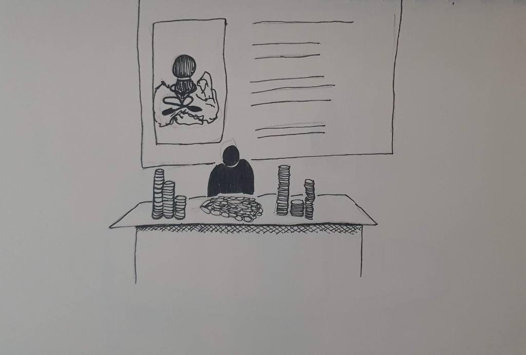 Attempting to conceptualise this character in a presentation format was by far one of the easiest and the first I came up with when considering my avenues. As an avid hoarder…I mean magpie artist, I tend to collect change and never bring it into the bank to be sorted and put into my account. This process has led me to use a medium-sized Tupperware container as a form of piggy bank, but in my eyes, it seems more like a miniature pool of coins the like of which you could envision Scrooge McDuck diving into. The plan for this concept was to portray me as a silent performer, letting the showcase play behind me as I ominously sorted through a large pile of coins, assembling them into scattered towers before ending the charade by sliding the coins back into the container and leaving without a sound. This concept stuck with me to the very end and I would love to attempt something like this in a future project, maybe as a strange animation or some form of piggy bank designed as a decrepit fortune teller who pushes coins about.