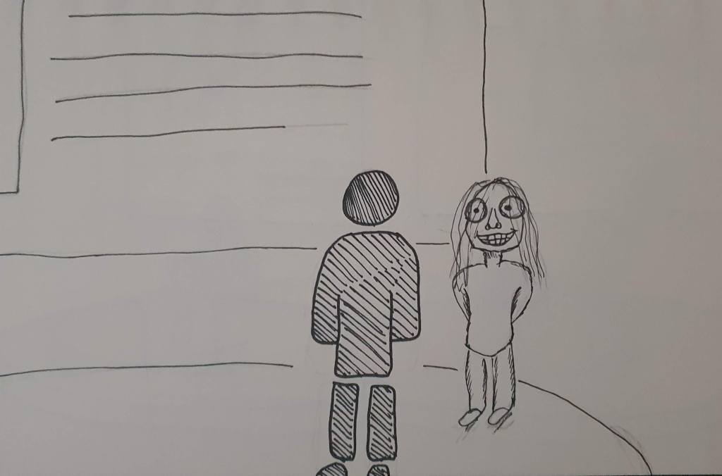 The next character originally stems from an overwhelming sense of discomfort I have when I feel like I am the centre of focus. Whenever I am speaking publicly or in a group conversation, I feel like all the eyes in the room are stabbing daggers at me which can cause me to either shut down or speak rapidly so that the focus on me can end. I took this feeling and characterised it as an evil entity that is always directly behind me glaring with big bulging eyes, watching you intently with sinister motives that get even more extreme if you ever catch a glimpse of them.