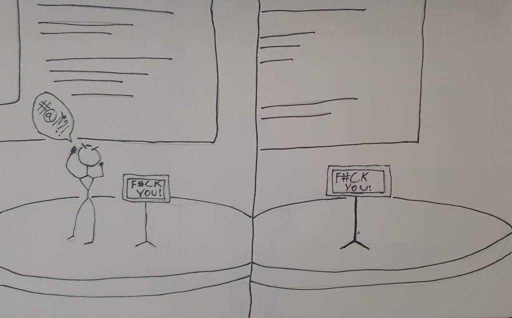 Now this concept was a beloved favourite of mine and would have probably ended up being my final presentation, but as much as I love Spite’s chaotic nature I knew deep down that I would never be able to pull this off. Since I consider myself to be a kind soul who wouldn’t do any harm, this concept still had a lot of pros rather than cons for me as it was a concept that involved the least amount of time for me to be the focus as well as being a concept that had the most shock factor. Essentially, this concept begins with me presenting the audience with a scrawled-out sign reading “Fuck You!” followed by me exclaiming “STARE AT THAT FOR 4 MINUTES, YOU CUNTS” before walking out of the room and never returning. The audience would then be forced to watch my characters automatically scroll through with an empty stage as I believed that due to how tightly scheduled the event would be, all participants’ times had to be followed through before continuing with the next presentation. This concept was the perfect embodiment of the rage I had been building up through this module, and if I had chosen it as my final piece I genuinely believe that it would have been such a stress release.