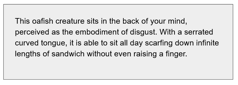 The next concept was based around Urglex, where as the showcase would automatically slide through the characters and their respective descriptions, I would be centre stage enjoying a meal of my own but in a globally viewed incorrect manner. This would involve me eating various foods in incorrect ways that would evoke a sense of disgust amongst the audience, such as eating a sub sandwich like corn on the cob and eating a KitKat in whole pieces without snapping it. This feast would also be accompanied by loud chewing and belches, showcasing a true personification of the character it would be resembling. This concept would later be what I settled upon using for my presentation, but obviously after a few tweaks to best suit a film format.