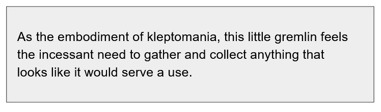 The way I envisioned spite before this project was a disembodied force that helped push me forward through tough times so that I was able to meet certain things whenever I was shut down in the middle of important tasks. When it came to the embodiment of Spite, I knew that it had to be a chaotic being that would scramble around whenever there was a fuss. I settled upon a goblin-type creature that didn’t care about how it presented itself to others, that would take all the anger and stress from a situation and use it as fuel to cause unbridled chaos when taking the reins.