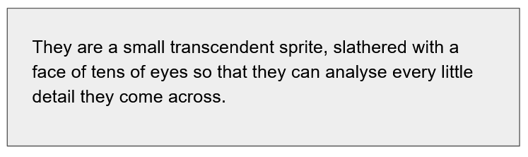 When it comes to the way I perceive the world, I tend to over-analyse a lot and process things differently from others. I absorb a lot of little details but it usually takes a few reruns of information before things start to stick. That is why I envisioned this as a small angelic kind of sprite, taking reference from biblically accurate angels by including an absurd amount of eyes so that they can analyse every little detail they come across.