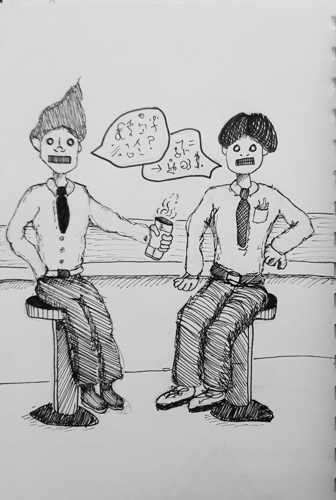 - 2 Finance Bros speaking Gibberish in a Queue – 2 Robots speaking robot at a bar.