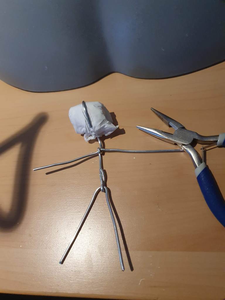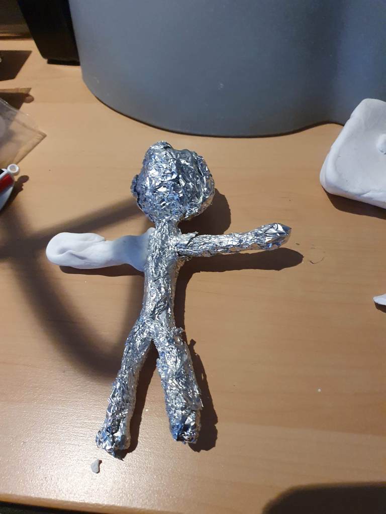 To start this process, I typically create a skeleton out of wire that consists of a long length for the spine and two curved pieces to be used as the arms and legs. Once the wire has been coiled together and the joints have been compressed with pliers, I find something soft and malleable to use for the base of the skull. Typically I used bubble wrap but at this stage of the project I didn’t really have any in supply so I did some quick thinking and used a napkin. At this point in the practice, I usually wrap the little person in string over and over until I have a full body but since I was working with clay, I thought it would be the best idea to wrap the body in tin foil and then proceed to layer on the polymer clay until the whole body was covered. Once the whole body had a layer of clay, I would have used tools to carve details into the material to try and create a string-like texture as a homage to the original styling of a Steve.