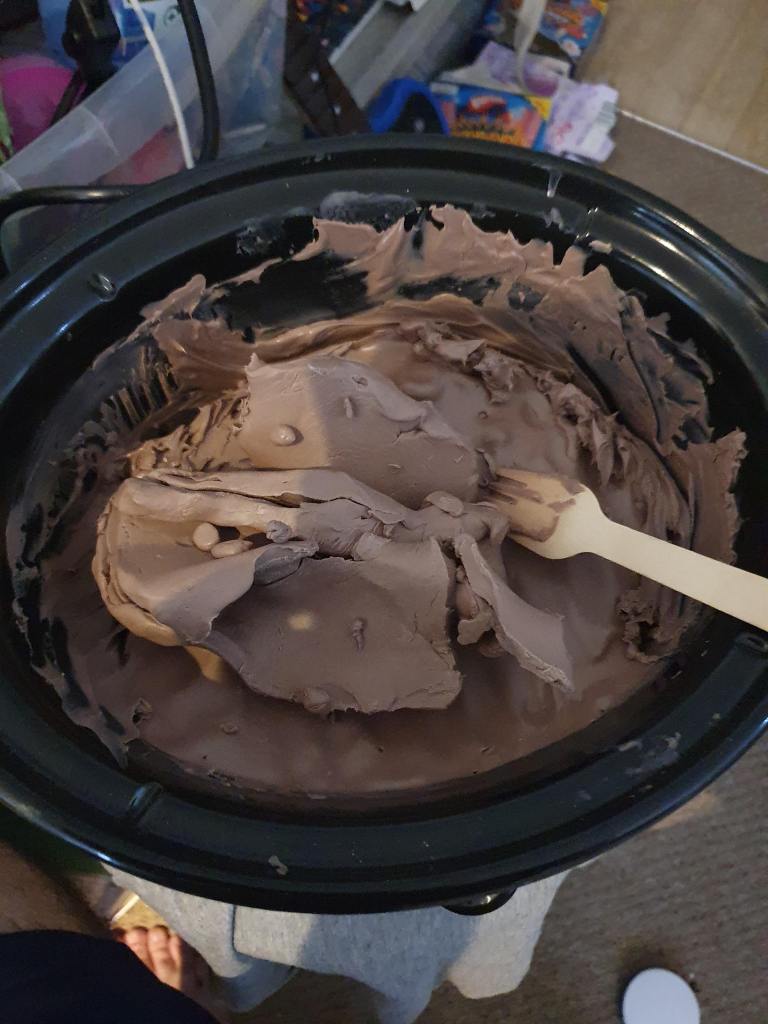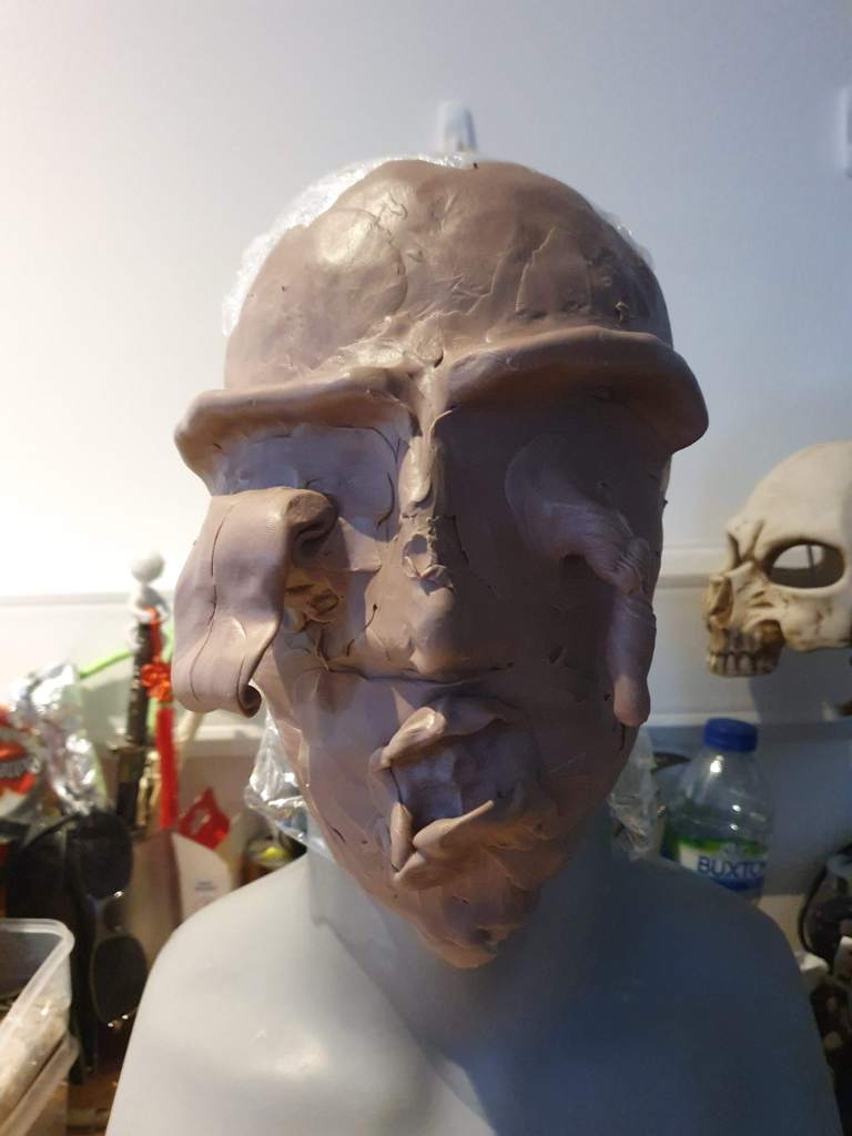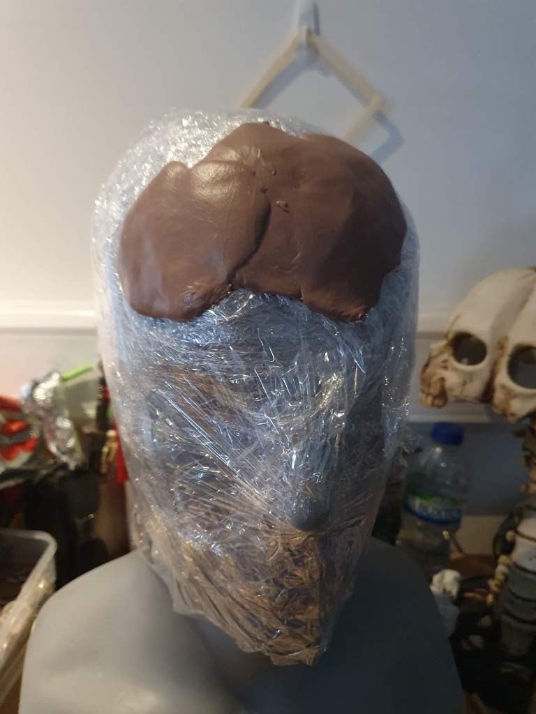 Typically with Monster clay, you create a base-level design that you hope to mass produce and then cast it in latex so that you can create a mould rather than having to recreate the same mask over and over with clay. However, from past experience, I hate using latex due to its over-empowering odour and slimy texture which is an attack on one sense too many for my tastes. Therefore when it comes to making with monster clay, I usually just have fun with it and make something which tends to stick around for a while before I get bored of looking at it and melt it back down again. Since this clay is malleable under heat, I store it in a crock pot so that it is easy to heat up when needed while also being self-contained in its own dish for storage. To start this process, I let the clay heat up and while I wait I spend some time wrapping up Brian in multiple layers of cling film so that the clay doesn’t stick to his skin (since it is a pain in the ass to clean off). Once Brain is mummified and the clay is liquified, I scoop up clumps with my hands and patch layers onto his face, slowly building up until the areas I need to be covered are built upon with a solid foundation of clay.