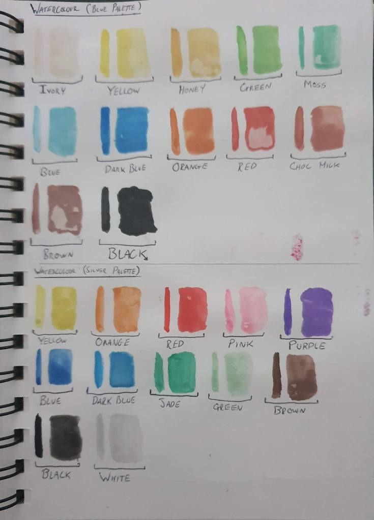 After testing out all the different tools I had in my possession, I came to the conclusion that pens are my go-to and have been since the dawn of time. Since I have trouble with dexterity, it can be a pain in the ass to control a brush so not having to do that with a pen is a godsend as well as being able to achieve the same levels of colour with enough pens. However, through making these sample sheets, I have fallen back in love with using watercolours and plan on practising more with those in hopes of using them along with pens to create illustrations.