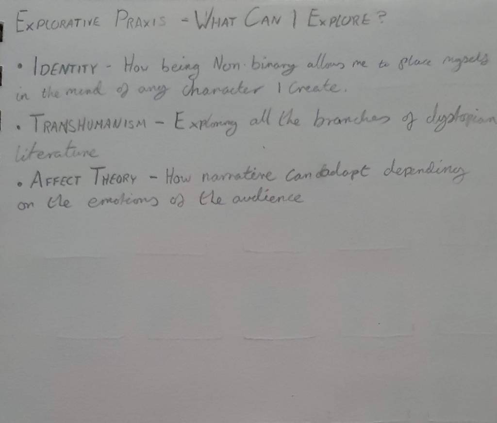 After writing down what core aspects I wanted to work on for this module, I was left with a couple of questions on how I could be able to tackle the next steps of this project. The main problems I first encountered were how could I experiment and what I could explore, which in other words translates to what I could create physically and what I could research. I knew that we were given free rein with what we could look into as well as not provided a cap point on how many avenues we could venture down. Therefore, I decided to write down as many things my mind could come up with at the time and what practices I could work with in collaboration with the core aspects I had jotted down before. This led to a lengthy list of materialistic practices that I could work with to create physical things to showcase what I wanted to work on. However, when it came to what I wanted to research, there were only 3 key things that struck out in my mind on what I could look at from the theory side of things. Since my handwriting is abysmal and can be very difficult to interpret, I took the liberty to type out what I have written so that you can have a better context of where my thoughts were at during the beginning of this module.