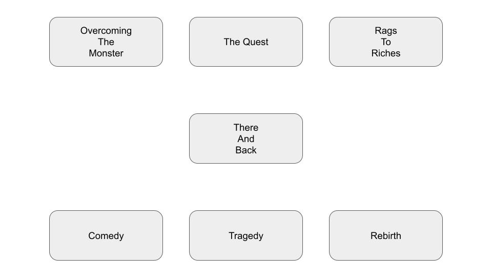 Another example of what was taught in the masterclass that had relevance to my research was titled “The 7 Great Narratives” which involved the lecturer giving a list of the plots with their respective definitions along with a few examples that best fit each plot. However, due to the alarming speed at which this man was whooshing through this topic, I found a lot of empty gaps in my notes for the aforementioned examples so with due diligence I went ahead and filled in the gaps myself after the fact.