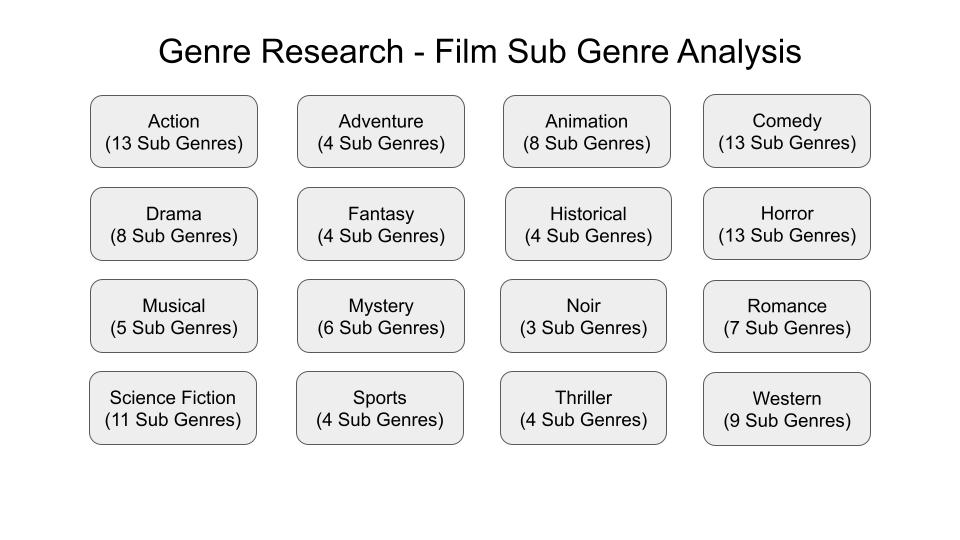 At the start of this project, I knew that genre would play a big role in what I wanted to research, and that is mainly due to the fact I was intrigued by the vast spectrum before the module even began. I had plans to dip my toes into the sea of genre as a fun side project to learn more about what lies beneath the surface and how the influence of genre affects a piece across all types of mediums. So when the opportunity arose that I could guide my own research with no restrictions, I took that as the go-ahead to just dive head first into the vast ocean of genre and study all the different types I could get my grubby little mitts on. Before fully getting my head stuck into the research I did set myself some boundaries to what I should look into, mainly because I would be exploring a lot of avenues within this project and I didn’t want to confine myself to a singular subject. So with that in mind, I only looked at the genres of Film due to this medium being the primary source of narrative I absorb nowadays as well as being the medium with the lowest amount of subgenres. Overall, I will say this method of practice was an overwhelming success as it brought me a lot of joy, due to its repetitive nature, whilst also allowing me to learn more about the various aspects of what classes a film a certain genre. Through this research, I found that there is a lot of generalisation when it comes to the categorisation of film as well as a large neglect for subgenres mainly to allow for easier navigation when searching for specific media. Therefore with this newfound knowledge, I hope to further apply this research to my own narrative concepts so that I can diminish the neglect of subgenres in my own work while also creating a system that will help me develop stories across genres even if they derive from the same concept.