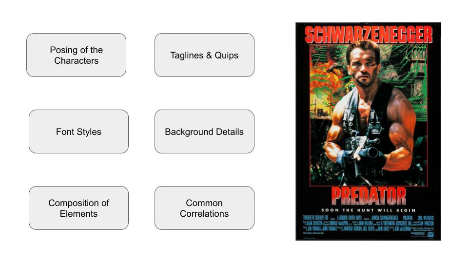 Common Correlations – Across all examples used within the subgenre, what do the posters themselves have in common with one another? (Example: Predator shares similar styles of character posing as well as unique font choices with the other examples within the Action/Horror subgenre.)