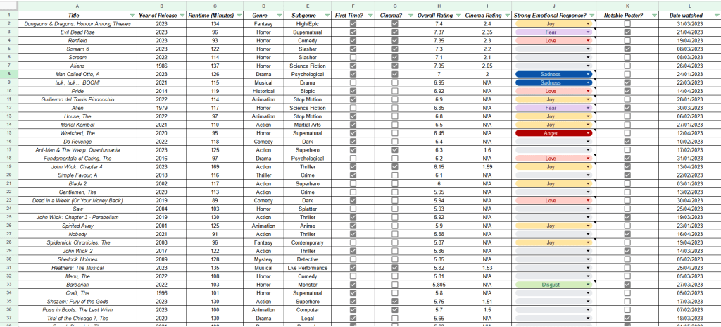 I wanted to use this year as a form of practice run for keeping track of narratives I observe daily so that in the future I can do the same for books. Since the majority of my library is in storage, I wasn’t able to include them within the goals set for this year but I hope to include them in future years as time goes on. This project was supposed to be just a fun side project I kept daily tabs on but since the beginning of this module, I have transformed it into a data analysis format that helps build my critical thinking as well as keep track of special criteria of data that I didn’t originally plan for. At the start of the year, the only data I was keeping track of were Titles, Years of Release, and Rankings as this challenge was originally formed to help keep track of things but also to help me stop watching films for pure enjoyment and actually offering my own opinion. After applying my research from this module, I have incorporated genre classification to help myself figure out what narratives fit which genres as well as take notes on which posters have unique identifying features that I would want to study further. These posters have also been collated into a collage-type format that I developed when producing a visual outcome for my initial genre research. In regards to affect theory and wanting to work more with emotion, I also kept track of which films evoked a Strong Emotional Response from me and which emotions were felt within those moments, keeping notes on the specifics of what made me feel that certain emotion.
