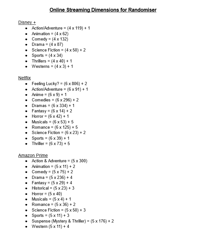 As a part of my data collection for cataloguing films, I found that statistics concerning genre tended to gravitate to certain ones while leaving others barren. I found that when in a slump of trying to figure out what to watch, I either choose something I haven’t seen in my preferred genres (Horror, Comedy and Drama) or rewatch something I find comforting or nostalgic. Since I knew the goals set for me were to comprise half of my data from new watches as well as desiring a more diverse body of research when it came to the genre, I tried to think of ways to help combat this issue and figure out new methods of decision. That is when I came up with the idea of leaving my choice up to chance and letting the decision of what to watch be chosen by a randomly dictated number, allowing me the freedom to not stress over what to choose as well as opening up the opportunity to observe narratives I had never had thought to watch. However, since I didn’t have a clue how many films I had access to whilst also wanting genre to play a massive factor in the decision process, I took it upon myself to collect data on how many films existed within each genre that were available on each of the streaming platforms that I use for entertainment