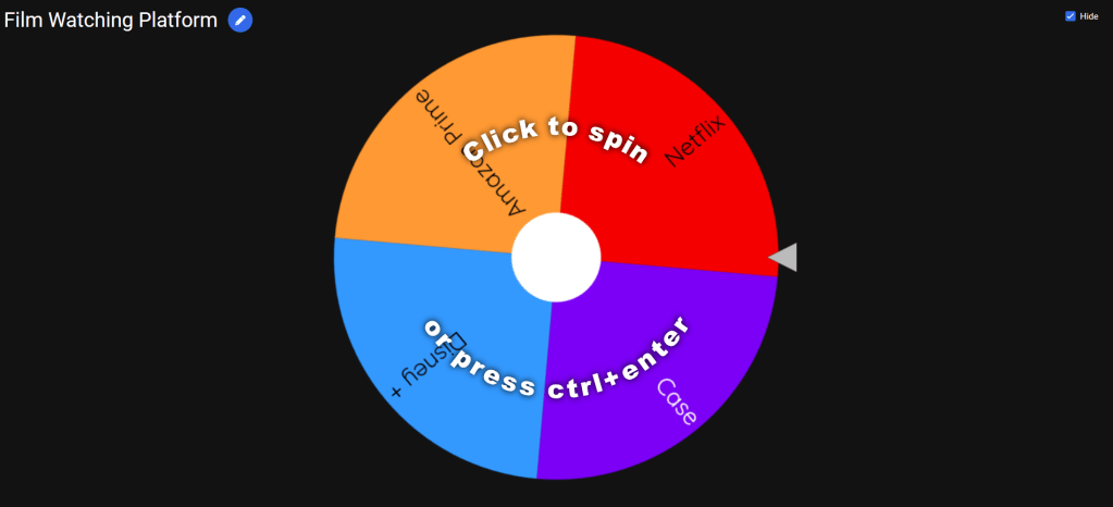 After gathering all of the data needed across all the platforms, I created a series of randomiser wheels that would decide upon a genre equation that I would use. The wheels consist of one to decide which platform to use and then 3 wheels for each of the platforms filled with the respective genres that they offer. Once I have been given an equation, I solve for the total number of films and feed that number into a Random Number Generator to choose a number between 1 and the total number provided by the equation. This randomly decided number will then lead me to my randomly assigned film and voila Bob’s your uncle, job’s done. Granted this process could be simplified a tad but since I have a love for maths and solving puzzles, I kept them in to add to the joy I have with this project. Plus I am the only one crazy enough to use this process anyway so it doesn’t really do much harm.