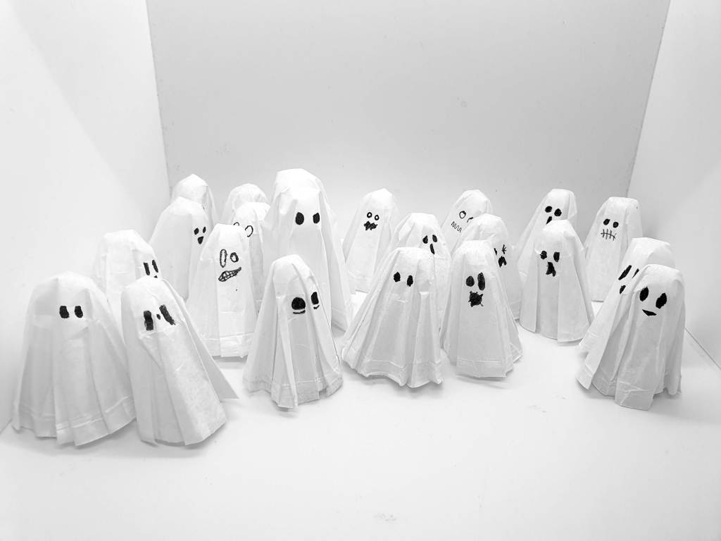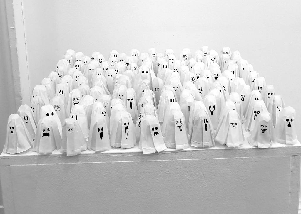 An unexpected dilemma came from actually making the ghosts stand on their own, as it was considered to be a challenge in itself. Normally they can stand on their own but I needed to give them a bit more core strength if they were going to stand the test of time being on display in the exhibition. My mind went to using plastic holders to put them onto but I couldn’t find any that could fit the size of the ghosts themselves which left me with no other choice of making their skeletons myself. The process I landed on was scrunching up tin foil into these monolith-type structures for the ghosts to sit upon when put on display. With these in place, they were able to withstand a hefty flick without falling over so in theory they could withstand potential prodding and poking from random passersby. The main issue was tackling the potential domino effect that could occur when one ghost is knocked over with such a force that the other ghosts would fall over and end up creating a disaster. I chose to go with blu tack to stabilise the skeletons to the plinth as it’s a sturdy adhesive, but after having to peel every glob of it off of the plinth myself I now wish I had gone with double-sided tape as a more easier-to-clean stabiliser.