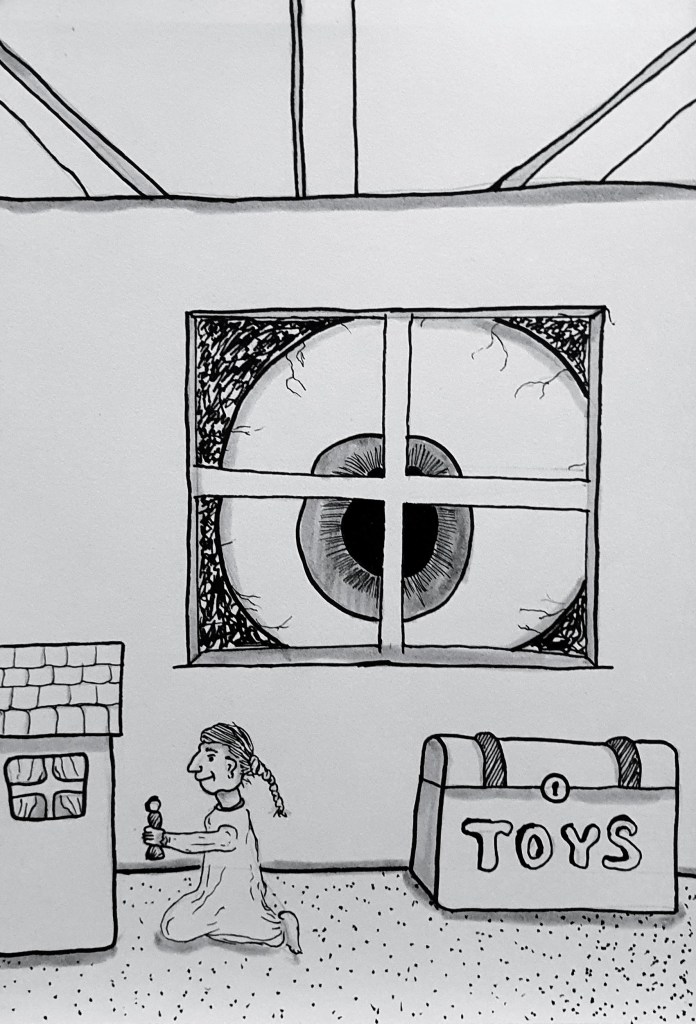 Once all the illustrations were sketched out, I began to go over them in ranging thicknesses of black pen to help develop a sense of depth depending on the layer I worked on. I mainly stuck to finer pens for details and patterns whereas I opted for thicker pens to fill out blocked silhouettes or outlines. I didn’t want to use my typical cross-hatching technique for filling out shadows so I chose to blend pencil to create a fuzzy texture if the drawing required fabric like the dressing gown of the protagonist. To help give a sense of 3D and allow for the illustrations themselves to pop off the page, I used a variety of grey-toned pens to add layers of shadows under elements such as arms and clothes.