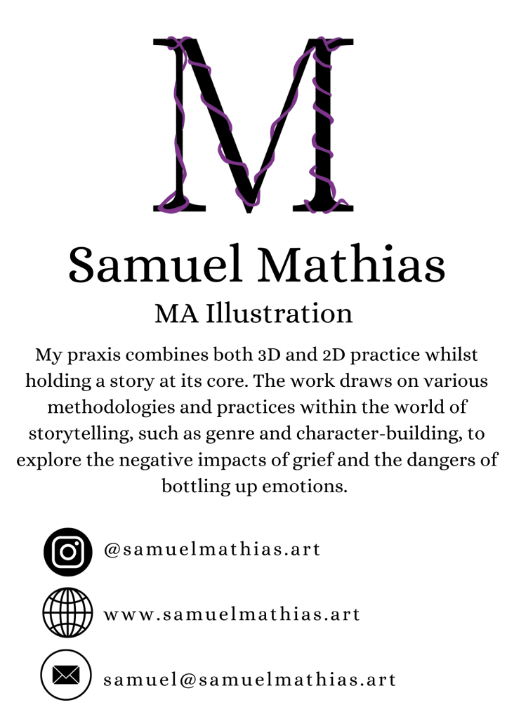 For the marketing materials, I knew that the main focus would be on the clustered ghost sketch as this was my title page piece as well as the most visually appealing illustration that I made for the project. The back is just a basic assortment of information which showcases my brand logo, a brief abstract about my praxis, and my social links to all the different accounts that are linked to my art. I mocked up all the elements within Canva and used Banana Print to make the cards as they were the same company I used to create the cards I had made for my BA Exhibition. They turned out a lot better than expected to the point where I am considering a similar layout change when I remake my business cards.