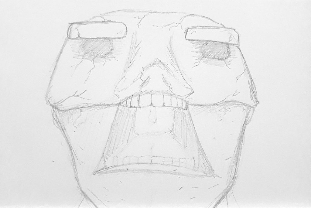 Once I had the design of the mask I wanted to use for the protagonist planned out, I set about figuring out the way it would begin to decay and crack as time went on. I knew that the mask would end up grubby and chipped but I wanted to accurately show how the cracks would form to create prominent damage that would cause it to eventually split in half the way I would want it to. I started by focusing on a central crack that would from directly across the mask starting at the sides and slowly working its way to the center under the nose. I then began to add extra cracks and chips around the sides of the mask as general wear and tear from the mask being worn for so long and having to be readjusted over time. Once those elements were in place, I added a few more cracks that would emanate from the eye sockets that gave the mask a more piercing look as well as resemble tears that the protagonist has yet to cry, foreshadowing the colossal release of emotion they have yet to unleash.