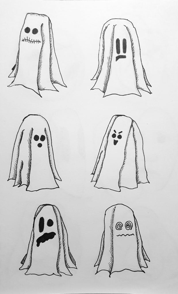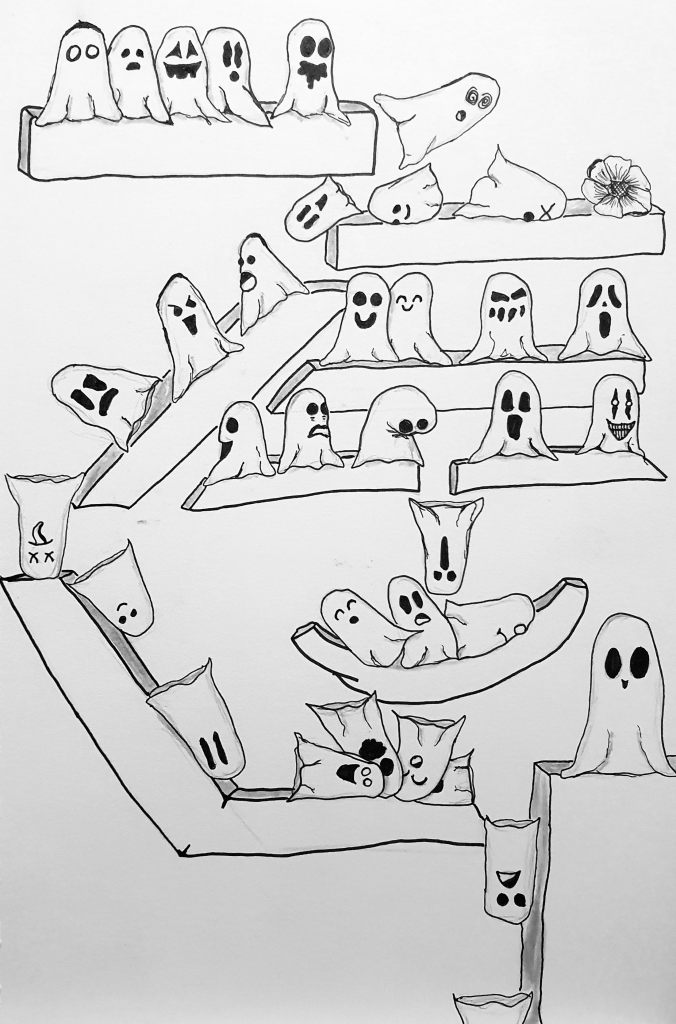 Once I had built up a significant body of ghosts, it dawned on me that if I was going to write and illustrate a story surrounding them then I should probably know if I can draw them. Since I was practically a pro at drawing their faces at this point, I knew that I had to focus on the form of the ghosts instead. So I began a few case studies to draw the ghosts at different angles as well as take note of the shadows of the folds to make sure their shape wasn’t lost in my sketches. After filling a couple of pages with them, I decided to try a drawing exercise of just stacking the little buggers on top of each other, attempting to create a “Where’s Wally” kind of effect where the ghosts pile together into clusters to see how they would all look jam-packed together.
