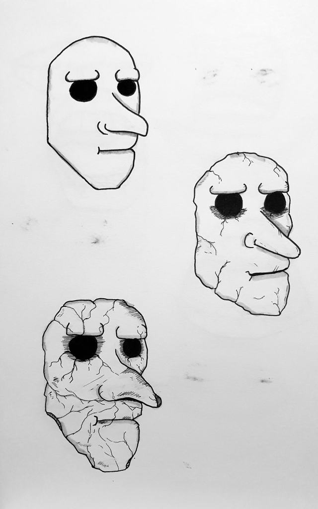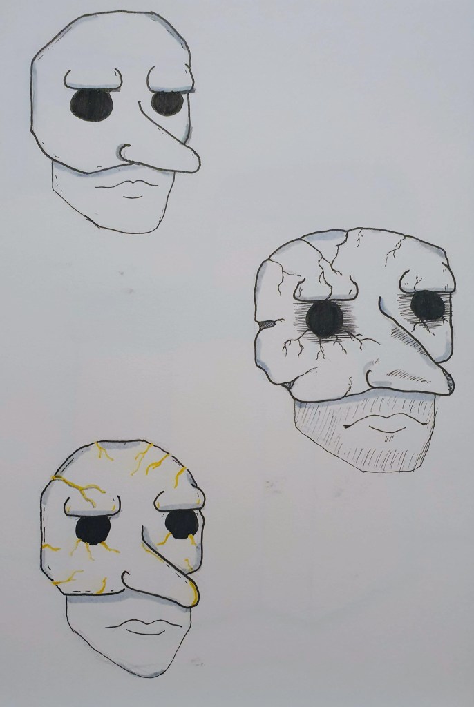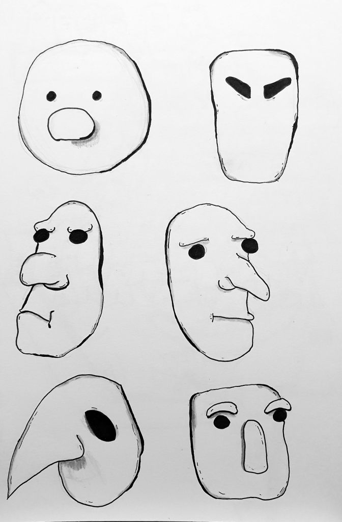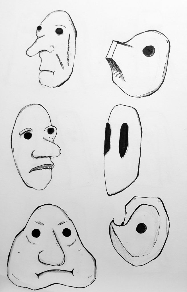 After drawing a few select examples of these masks, I went about designing a few of my own to figure out what kind of expression would be best for my protagonist. If I was trying to focus more on making within this project, I would’ve started experimenting with monster clay to try and create a 3D form of the mask itself to draw inspiration from. However since I wanted to focus more on the illustration side of things, I decided to not go in this direction which is probably for the best since I was never really good at ceramics and sculpting faces in the first place.