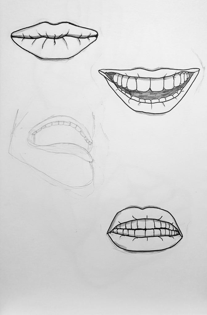 When it came to the story itself, I knew the protagonist would be wearing a mask for almost the entirety of the time. This meant I would have to be creative in the way I would convey the emotions of the character, especially if I wanted the emotions to be key to how the story is told. Once I had figured this out, I decided that a lot of the emotion had to be expressed through the mouth since I thought they would be the best avenue to showcase raw emotion. Since a segment of the story would be based around the mask breaking half to expose this area of the face during pivotal moments of emotional expression, I thought it would be best to conduct a series of studies that showcased a range of emotions that can be easily identified with just the mouth. Even if I didn’t end up using all of the expressions within the story itself, having this many studies helped better my understanding of measurements as well as the perspective of all the elements of the mouth when used correctly.