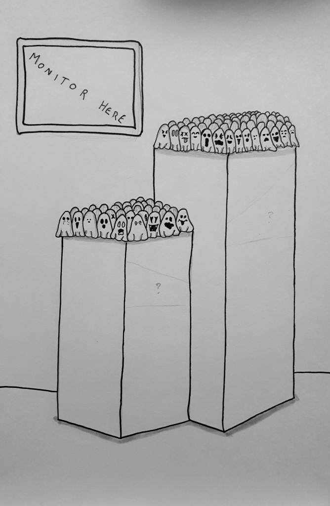 When it came to how I wanted the actual exhibition space to be laid out I had a clear plan of how I wanted it to look from the get-go. Since I wanted the animation to take the main focus, I knew that I had to limit the amount of making and keep it to a minimal use so I thought the best way to pull this off was to group them onto plinths. The plan was to make enough to fill the surface area of a couple while the animation would play on a monitor on the wall. However, I also wanted to play around with the concept of having the ghosts themselves move around the space and see what they would look like if they were full of life and mischievous. This would then lead to them running rampant all around the exhibition, hiding in peculiar places and getting mixed up in all kinds of shenanigans. As much fun as this concept would be, since the ghosts themselves don’t have minds of their own within the confines of the narrative it didn’t make much sense for them to be that way as a part of the exhibition.